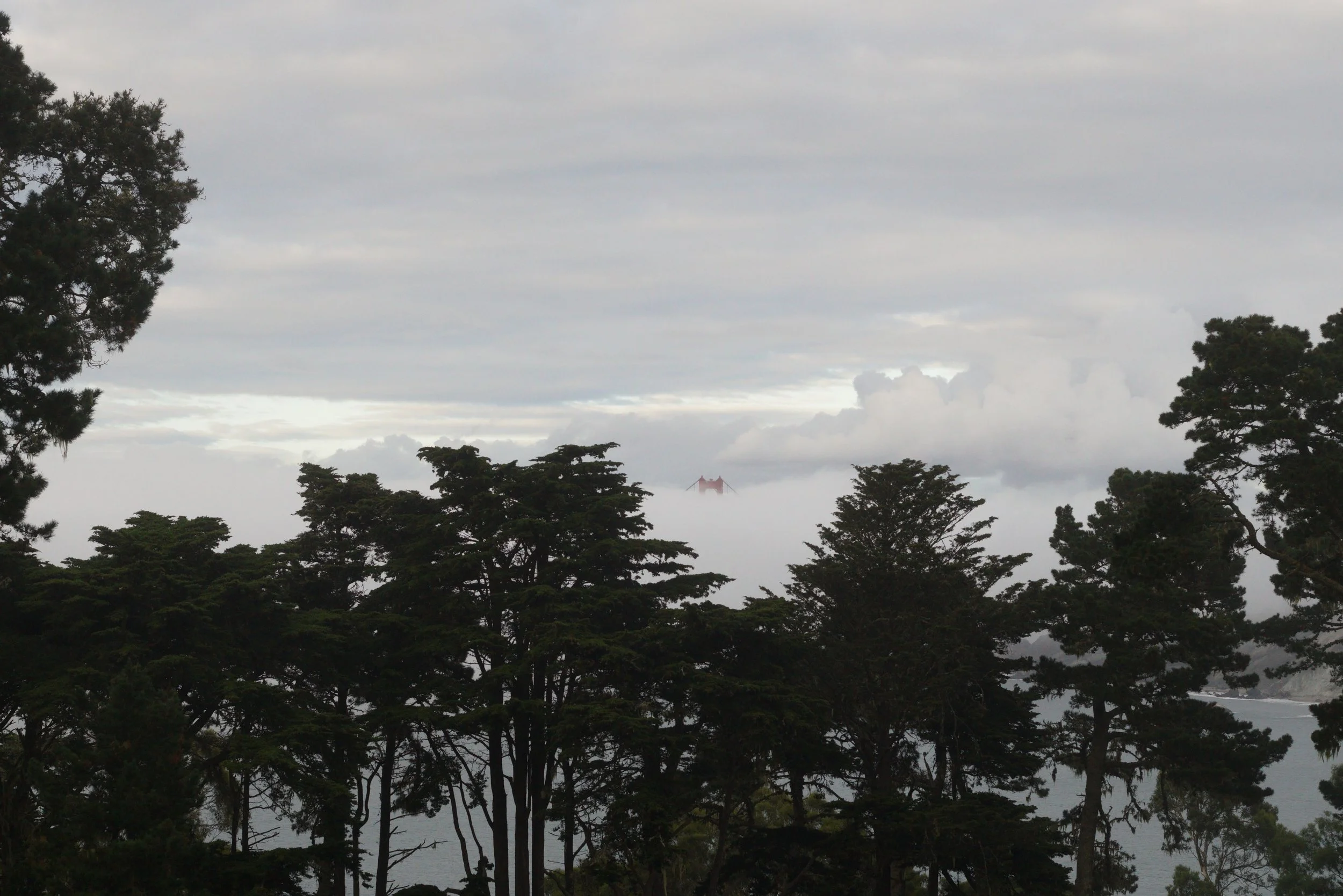 The towers of the Golden Gate Bridge are peeking out above the cloud layer